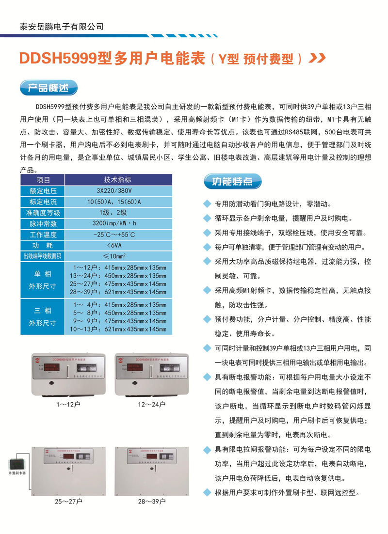 DDSH5999多用戶電能表(預付費型)是我公司自主研發(fā)的一款新型預付費電能表,可同時供39戶單相或13戶三相用戶使用(同塊表上也可單相和三相 混裝上采用高頻射頻卡(Ml卡)作為數(shù)據(jù)傳輸?shù)募~帶,Ml卡具有無觸點、防攻擊、容量大、加密性好、數(shù)據(jù)傳輸穩(wěn)定、使用 壽命長等優(yōu)點。該表也可通過RS485聯(lián)網(wǎng)500臺電表可共用一個刷卡器,用戶購電后不必到電表刷卡,并可隨時通過電腦自 動抄收各戶的用電信息,便于管理部門及時統(tǒng)計各月的用電量,是企事業(yè)單位、城鎮(zhèn)居民小區(qū)、學生公寓舊樓電表改造、 高層建筑等用電計量及控制的理想產(chǎn)品。
